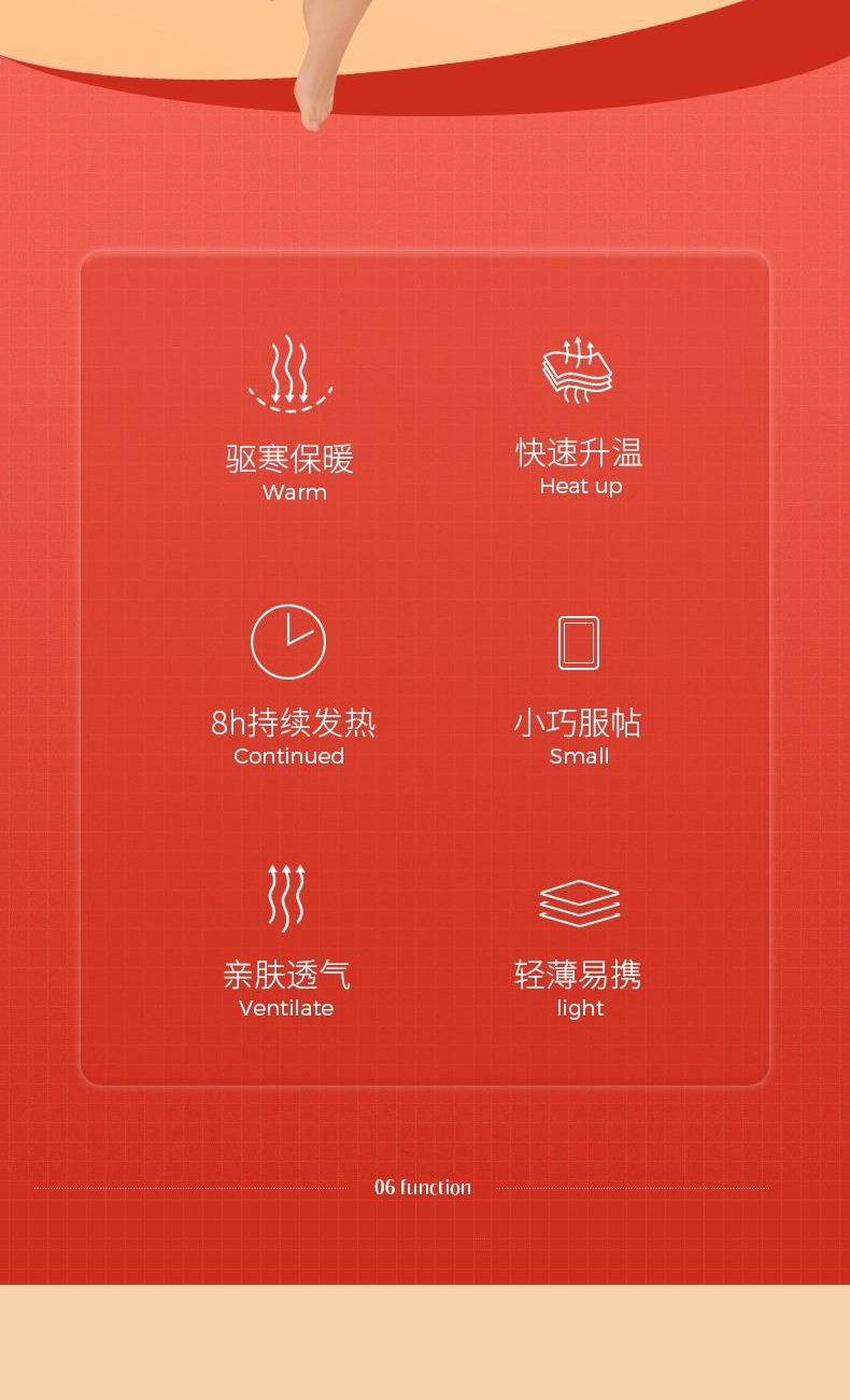 賣點 型號:NSQ1 功能:8h持續發熱,小巧服帖,親膚透氣 參數 1、精選優質無紡布,不含熒光劑溫和不刺激,溫暖的同時還能保證皮膚自由呼吸 2、輕薄易貼,溫暖0負擔、驅寒保暖,快速升溫 3、8h持續發熱,小巧服帖,親膚透氣