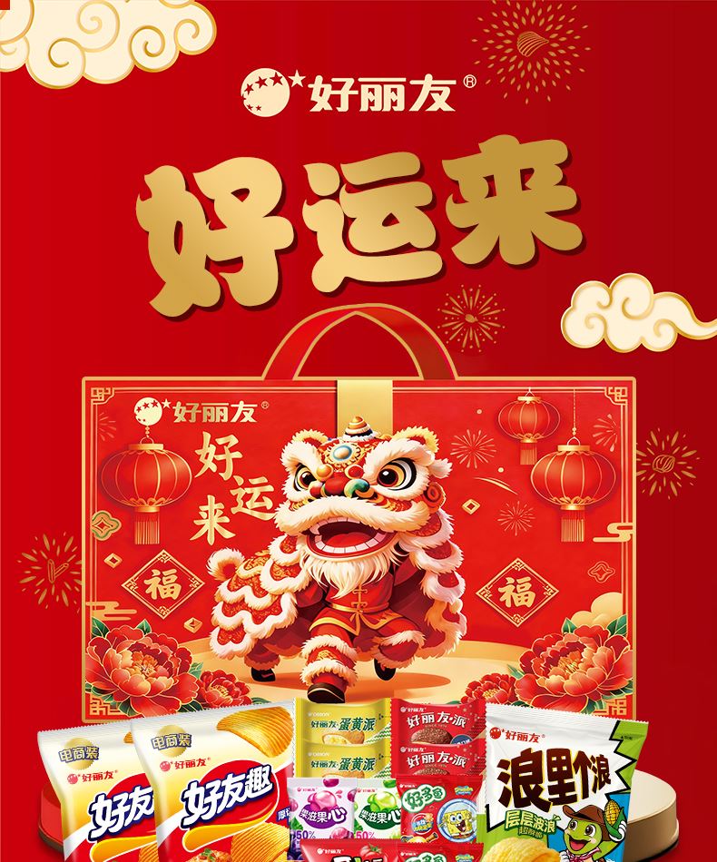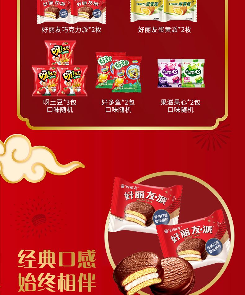 好麗友 好運來 禮盒329g 配置: 好麗友 果心16.8g×2 好麗友 巧克力派28g×2 好麗友 蛋黃派18g×2 好麗友 呀土豆12g×3 好麗友 好多魚19g×2 好麗友 好友趣45g×2 好麗友 浪里個浪40g×1