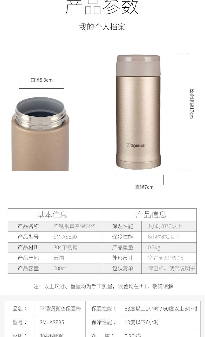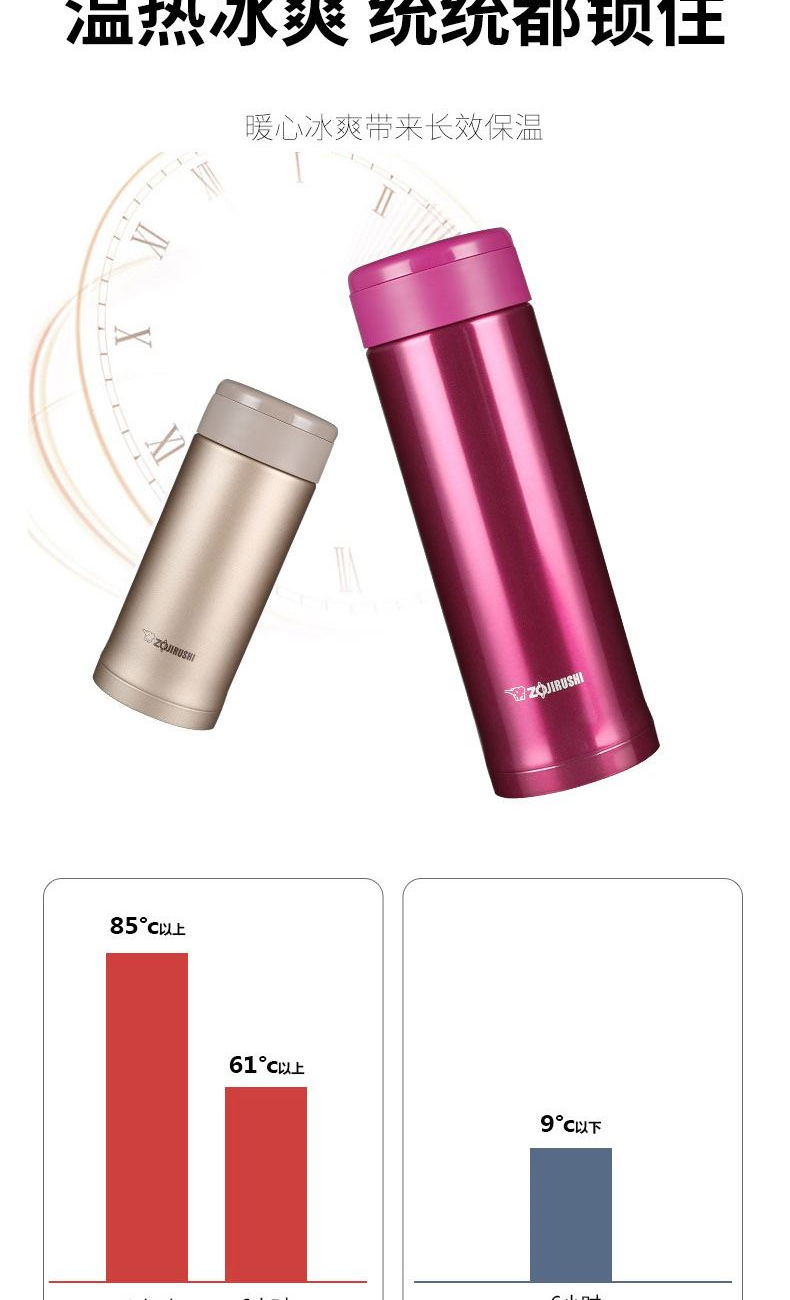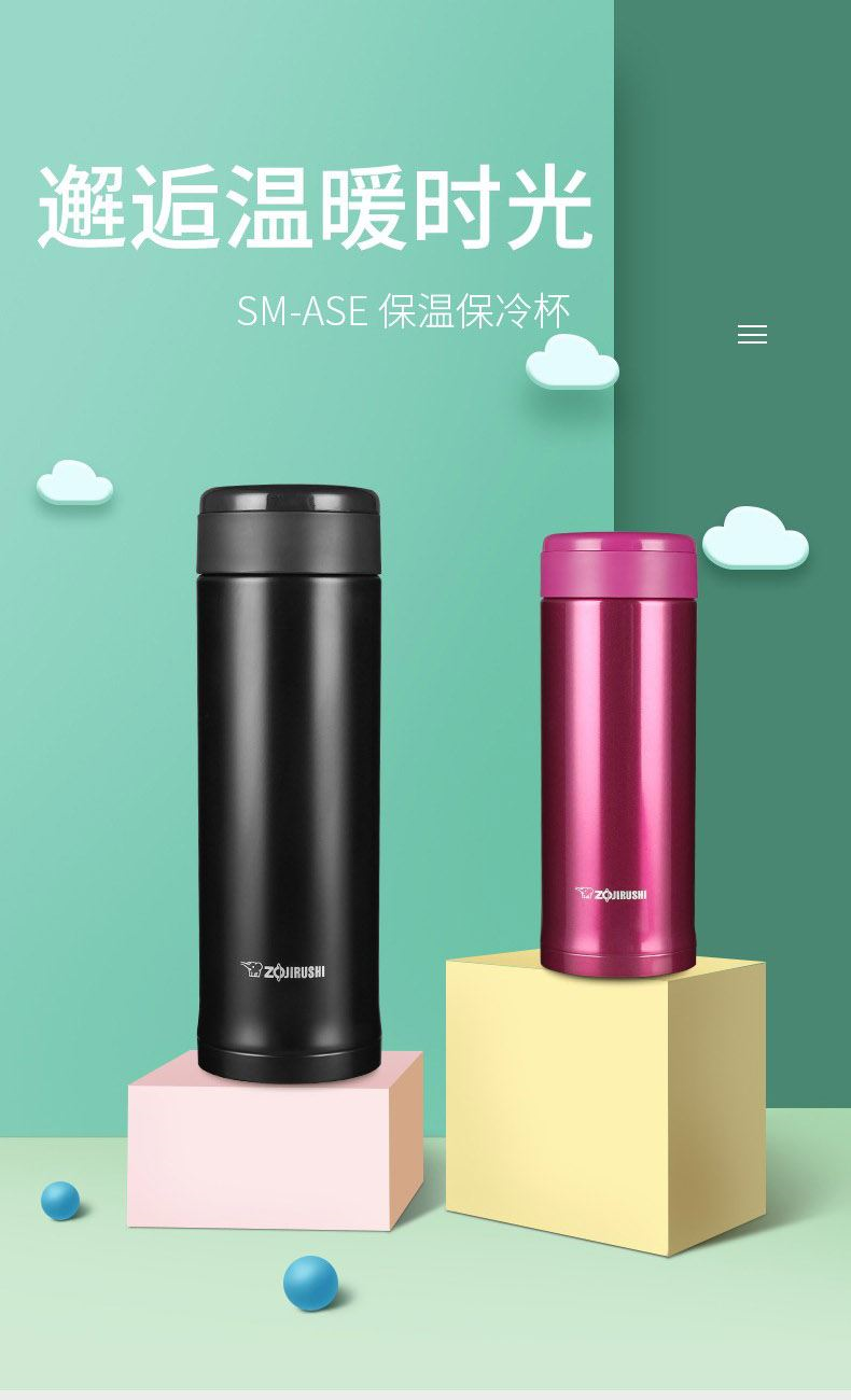 品 牌:象印ZOJIRUSHI 型 號:SM-ASE35 顏 色:金色/棕黑/紅色/粉色 容 量:350ml 類 型:旋蓋杯 帶茶隔 材 質:304不銹鋼 保 溫:6小時約60°C 保 冷:6小時約10°C以下 產 地:泰國