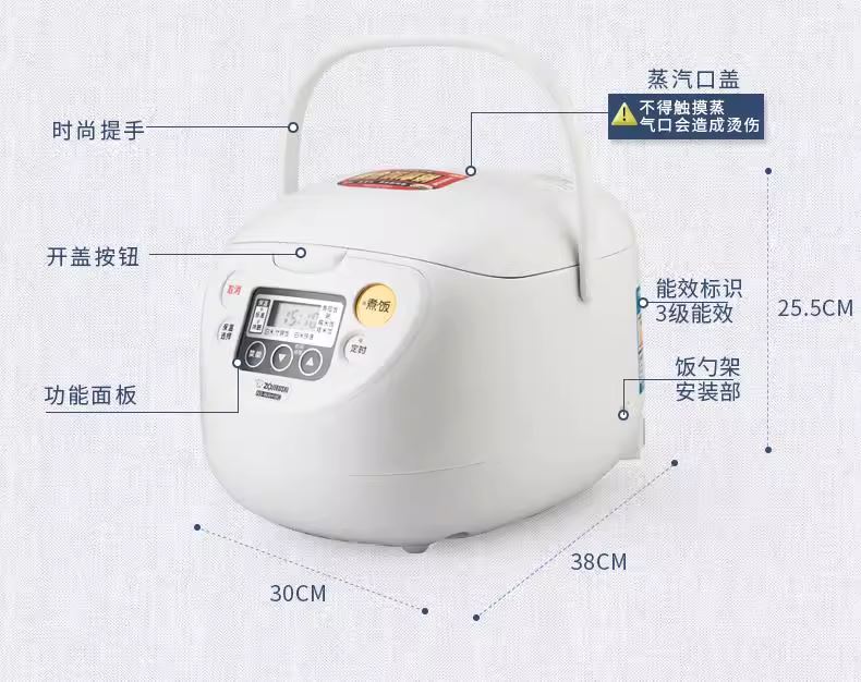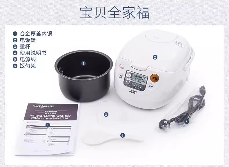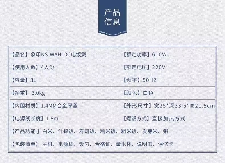 品 牌:象印ZOJIRUSHI 型 號:NS-WAH10C 顏 色:白色 容 量:3L 類 型:電飯煲 適合人數:4-6人 輸入功率:641W 重 量:約3KG 產 地:中國