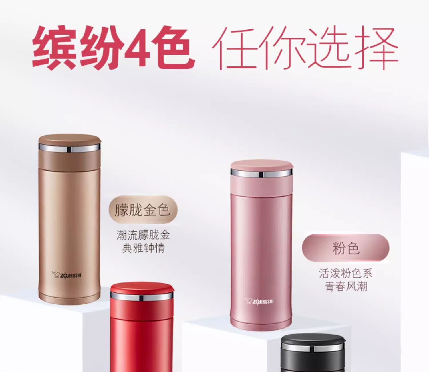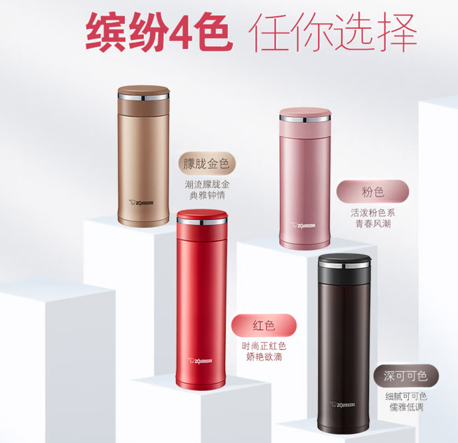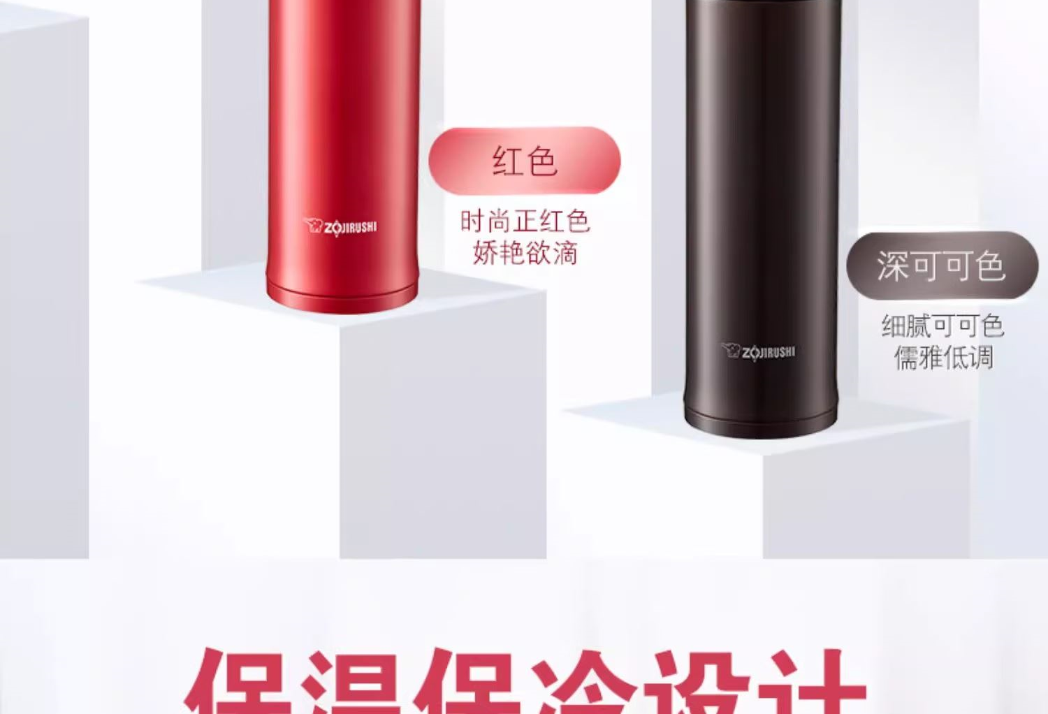 品 牌:象印ZOJIRUSHI 型 號:SM-JZ48 顏 色:TD棕色/NM香檳色/RA紅色/PA粉色 容 量:480ml 類 型:旋蓋杯 帶茶隔 材 質:304不銹鋼 保 溫:6小時約60°C 保 冷:6小時約10°C以下 產 地:泰國