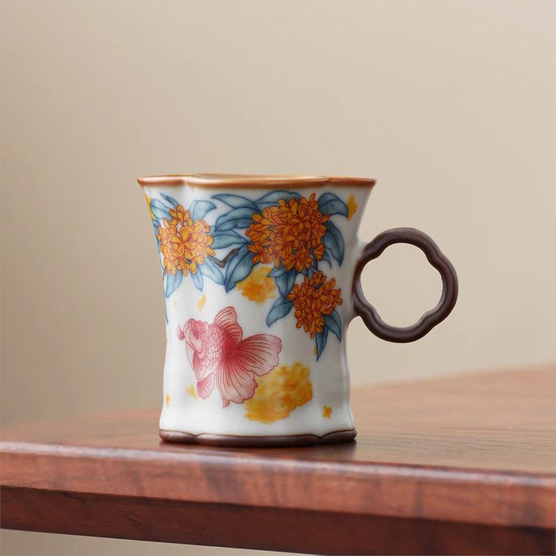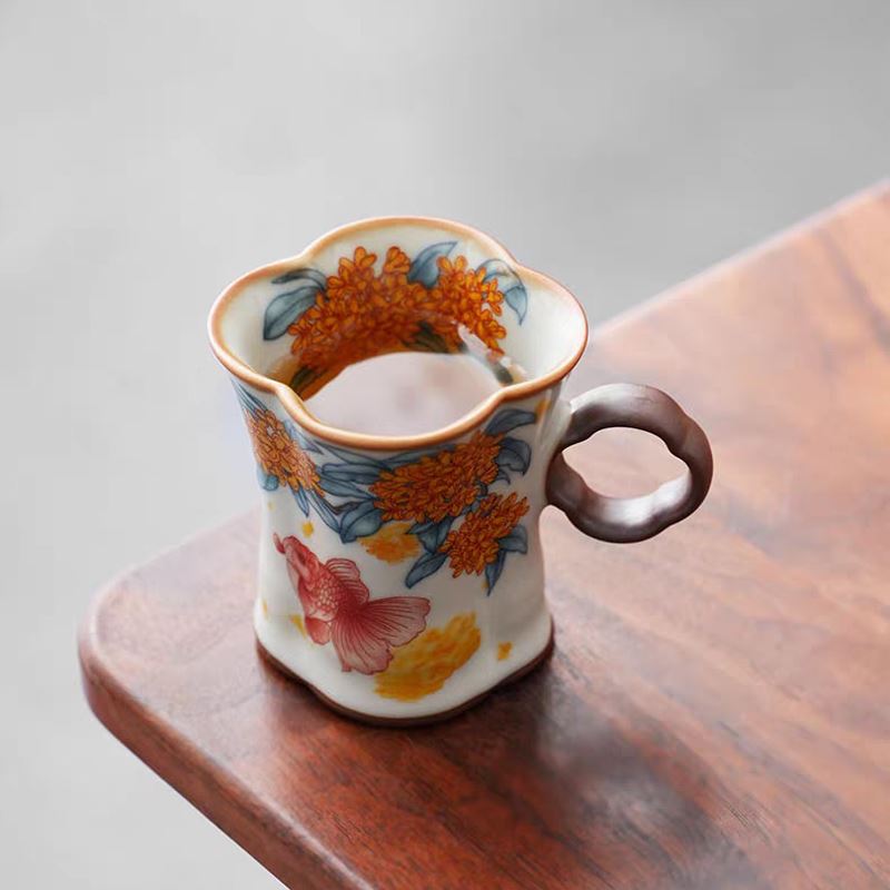 配制: 2杯 2盤 2攪拌棒 1禮盒手提袋 規格:杯子:8.8*7.3cm 盤 13.3*13.3cm 材質:黃汝窯 胡桃木 堆料。 推薦說明:金鯉桂花,寓意金貴。連年有魚。內外皆有畫面。瑪瑙入釉,蟬翼開片。亞黃汝瓷,技術新品,采用高價優質瓷土,紫口鐵足。立體浮雕杯身。杯身開片,可養瓷。