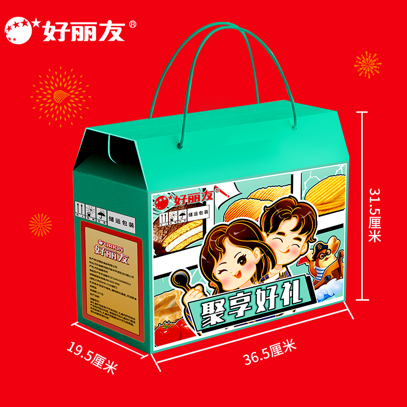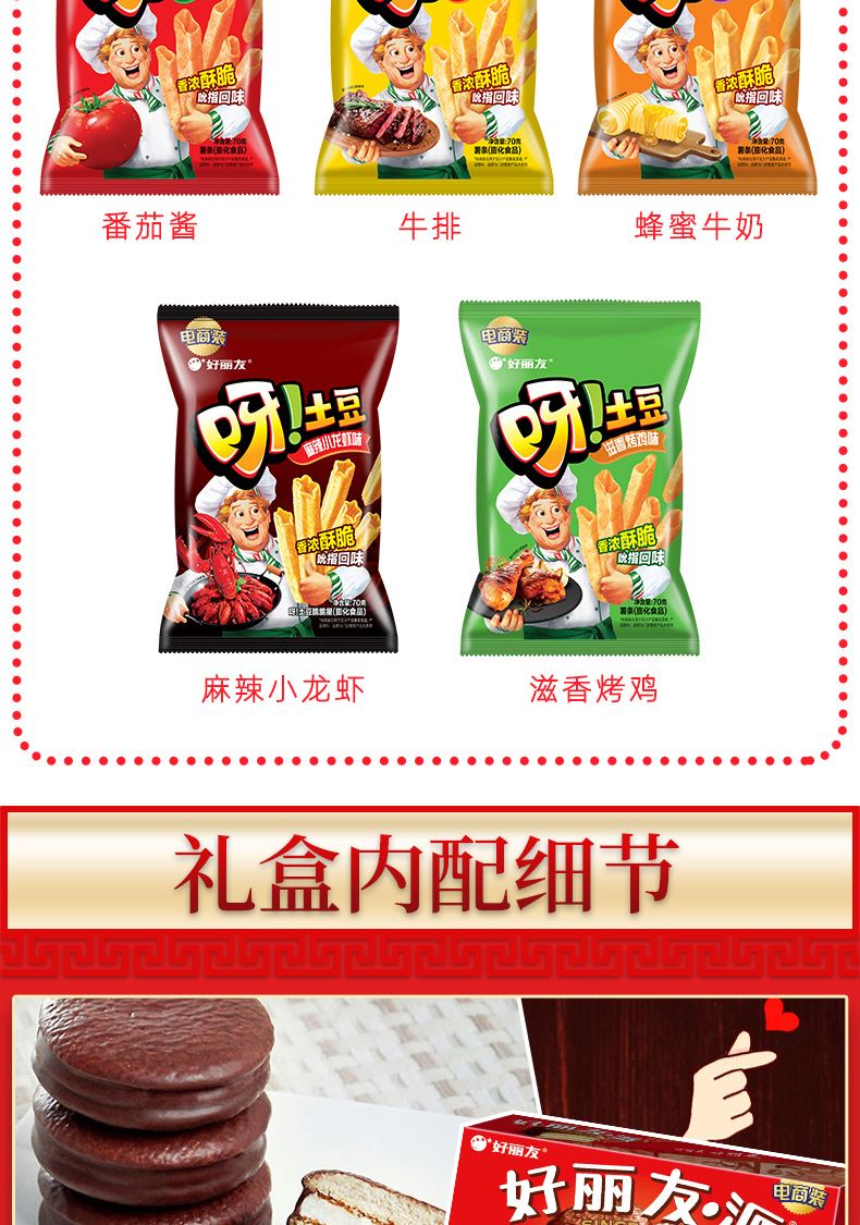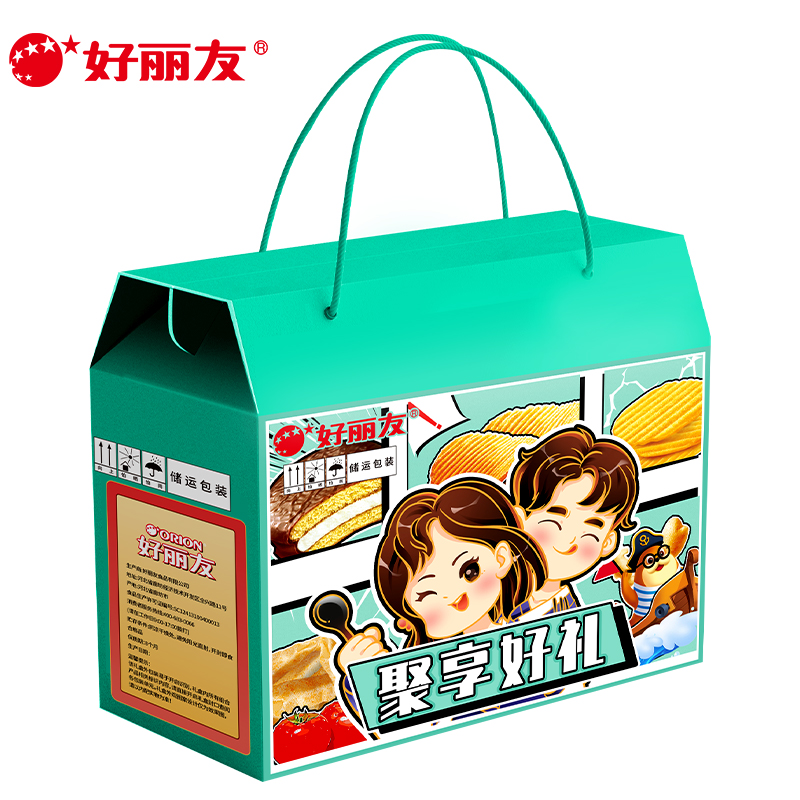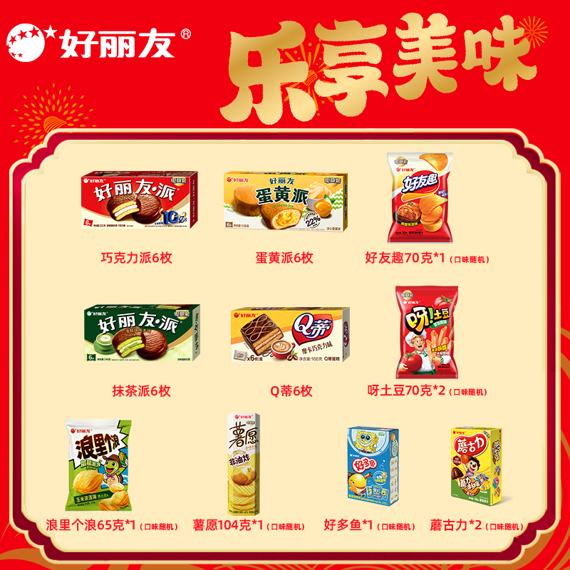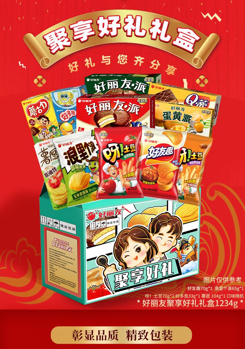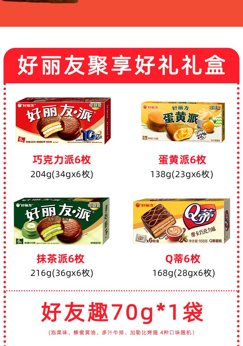 好麗友 聚享好禮 禮盒1234g 配置: 好麗友 巧克力派6枚204g×1 好麗友 蛋黃派6枚138g×1 好麗友 清新抹茶派6枚216g×1 好麗友 Q蒂摩卡巧克力味6枚168g×1 好麗友 浪里個(gè)浪65g×1 好麗友 薯愿2P104g×1 好麗友 好多魚(yú)33g×1 好麗友 好友趣70g×1 好麗友 蘑古力牛奶味48g×1 好麗友 蘑古力榛子味48g×1 好麗友 呀土豆番茄味70g×1 好麗友 呀土豆蜂蜜黃油味70g×1