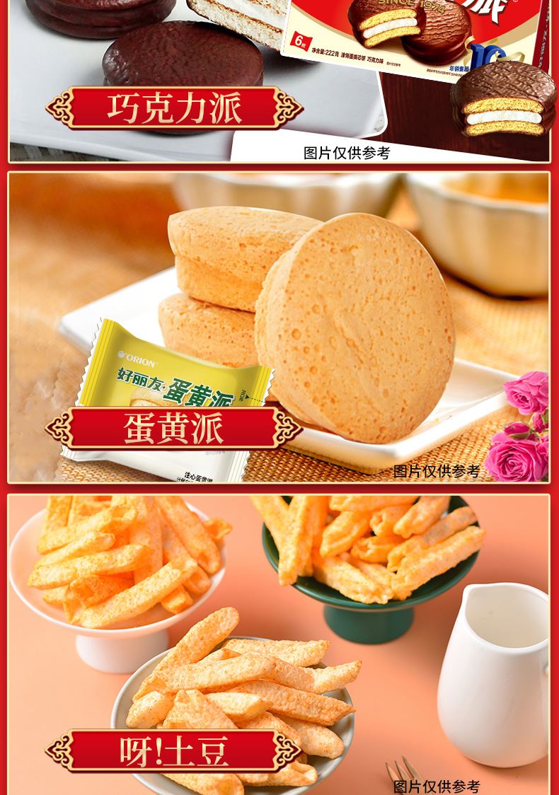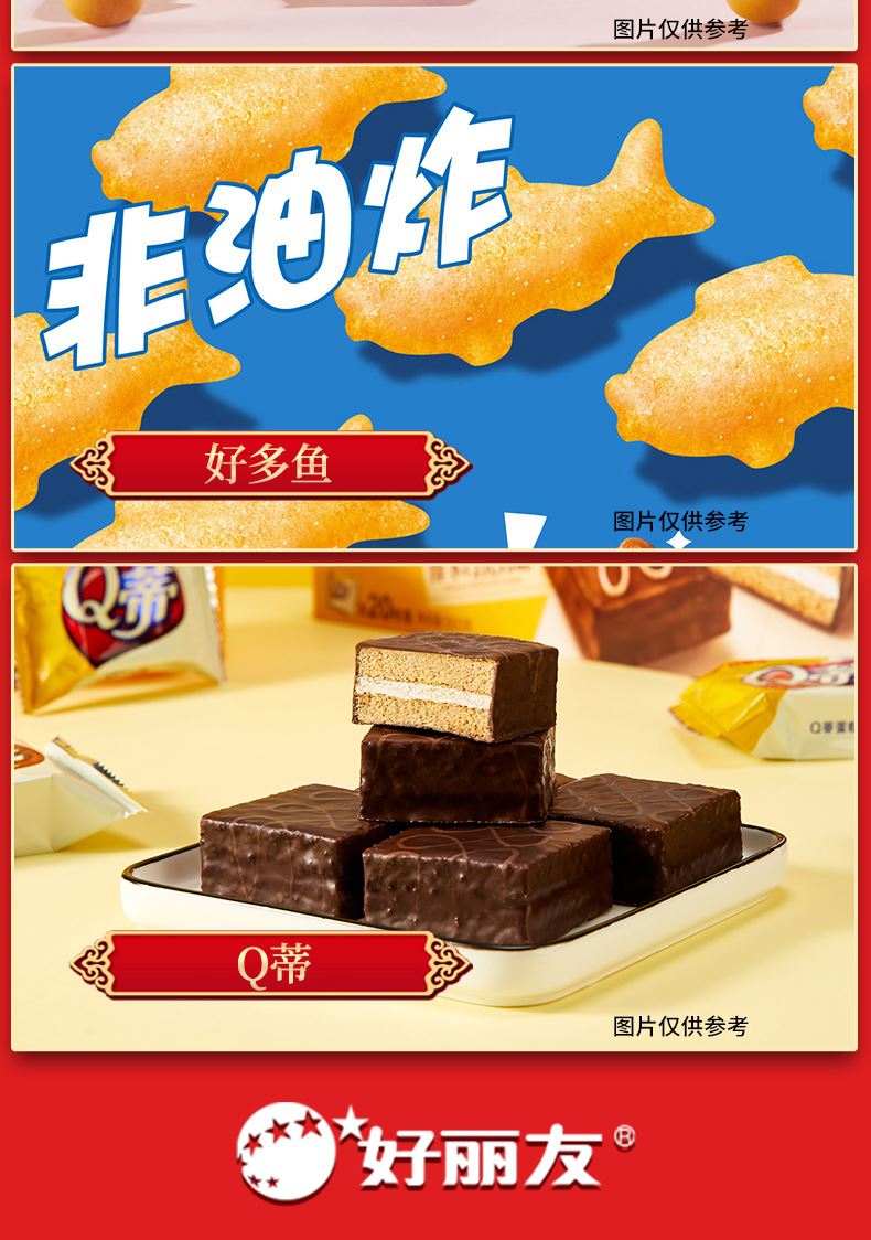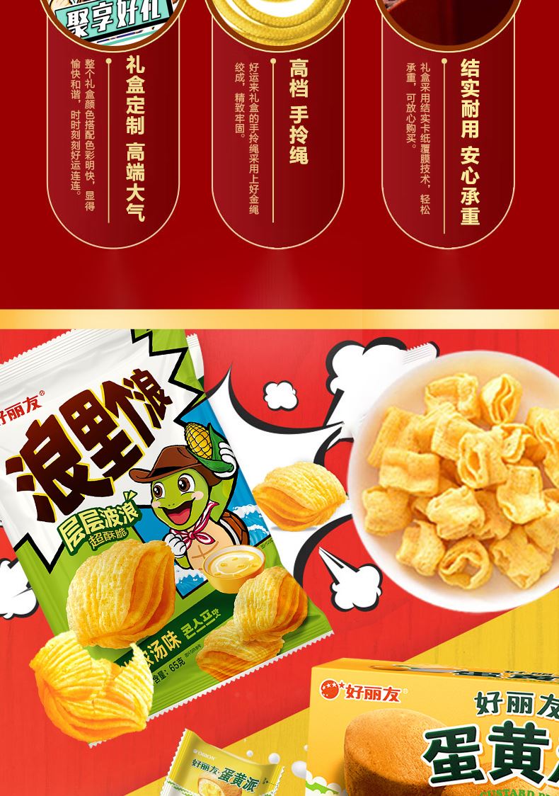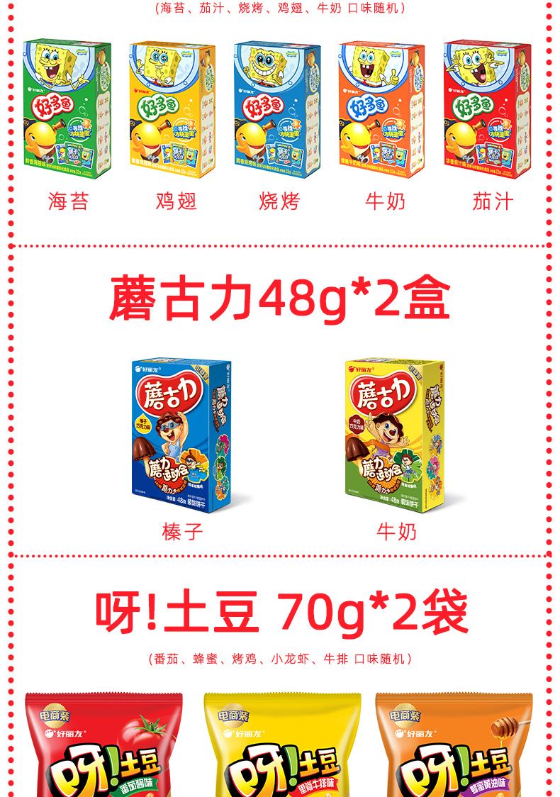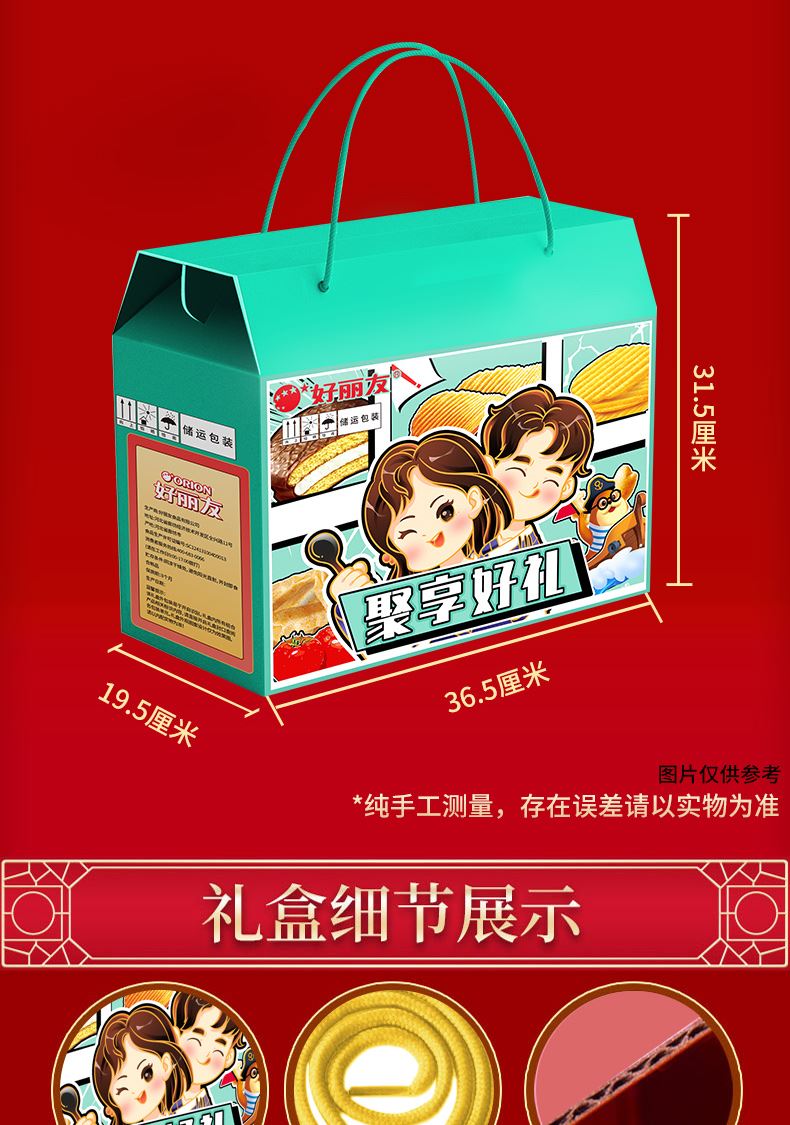 好麗友 聚享好禮 禮盒1234g 配置: 好麗友 巧克力派6枚204g×1 好麗友 蛋黃派6枚138g×1 好麗友 清新抹茶派6枚216g×1 好麗友 Q蒂摩卡巧克力味6枚168g×1 好麗友 浪里個(gè)浪65g×1 好麗友 薯愿2P104g×1 好麗友 好多魚(yú)33g×1 好麗友 好友趣70g×1 好麗友 蘑古力牛奶味48g×1 好麗友 蘑古力榛子味48g×1 好麗友 呀土豆番茄味70g×1 好麗友 呀土豆蜂蜜黃油味70g×1