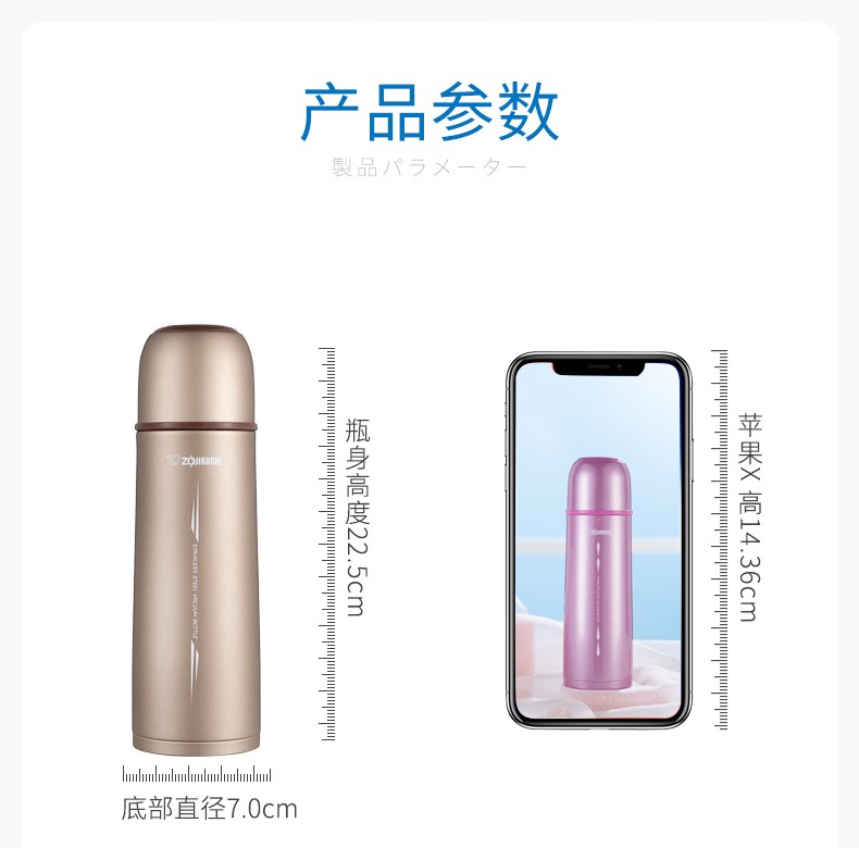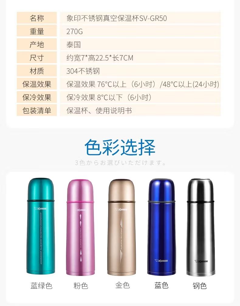 品 牌:象印ZOJIRUSHI 型 號:SV-GR50 顏 色:AA藍色/XA不銹鋼色/GL綠色/NL金色/PS粉色/TD咖色 容 量:500ml 類 型:子彈頭 蓋子當杯子 材 質:304不銹鋼 保 溫:6小時約60°C 保 冷:6小時約10°C以下 產 地:泰國